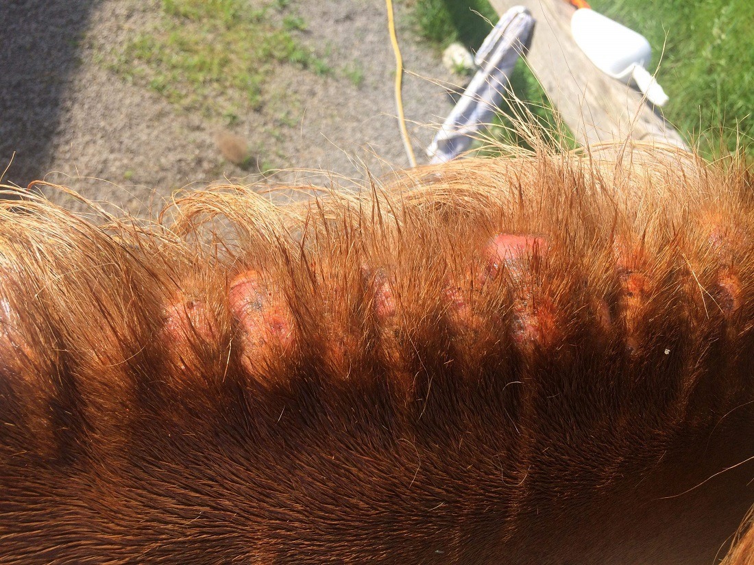 Te spremembe si konji povzročijo s samopoškodovanjem zaradi grizenja in drgnjenja srbečih predelov telesa ter se izražajo kot polomljena dlaka, poškodovana koža, sveže rane ali kraste, pri kroničnih spremembah pa se lahko pojavi tudi zadebeljena koža.